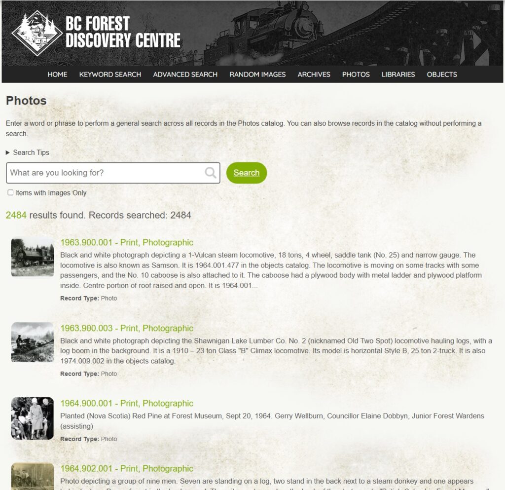 Last summer thanks to funding from Library and Archives Canada’s Documentary Heritage Communities Program the BC Forest Discovery Centre was able to tackle a project that had long been a priority but the museum lacked the hardware to complete it. This was to scan and make available digitally our substantial collection of maps, blueprints, and other large-format documents that were previously too physically large to be captured digitally at a high quality. The original goal was to scan and upload an estimated 1,300 documents for conservation purposes. Thanks to the hard work of the student we hired to serve as Digital Archivist, we were able to massively exceed the original estimates and scan 2,190 total large format documents. While we are unable to host all 116Gb of images on our website, we have descriptions including place names or contents of the files available on our website and can provide the full scale images upon request via Dropbox. We invite you to browse this new addition along with the large assortment of great historical photographs available on the photo archive section of our website.