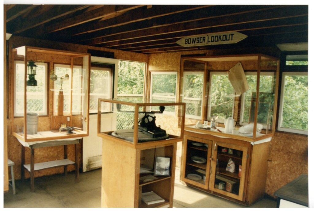 The tower is characteristic of utilitarian forestry structures of its era: featuring a tall, wood-framed structure with an enclosed wooden cab used for wildfire detection. These forest fire lookout towers would have been staffed through the fire season by spotters who would make continuous observations of their sight-lines and report any indications of a fire to crews who would then investigate. Now, though the function of such towers has been replaced by more modern modes of fire detection, they retain an allure that makes them excellent tools to start conversations with our visitors around fire safety and awareness.